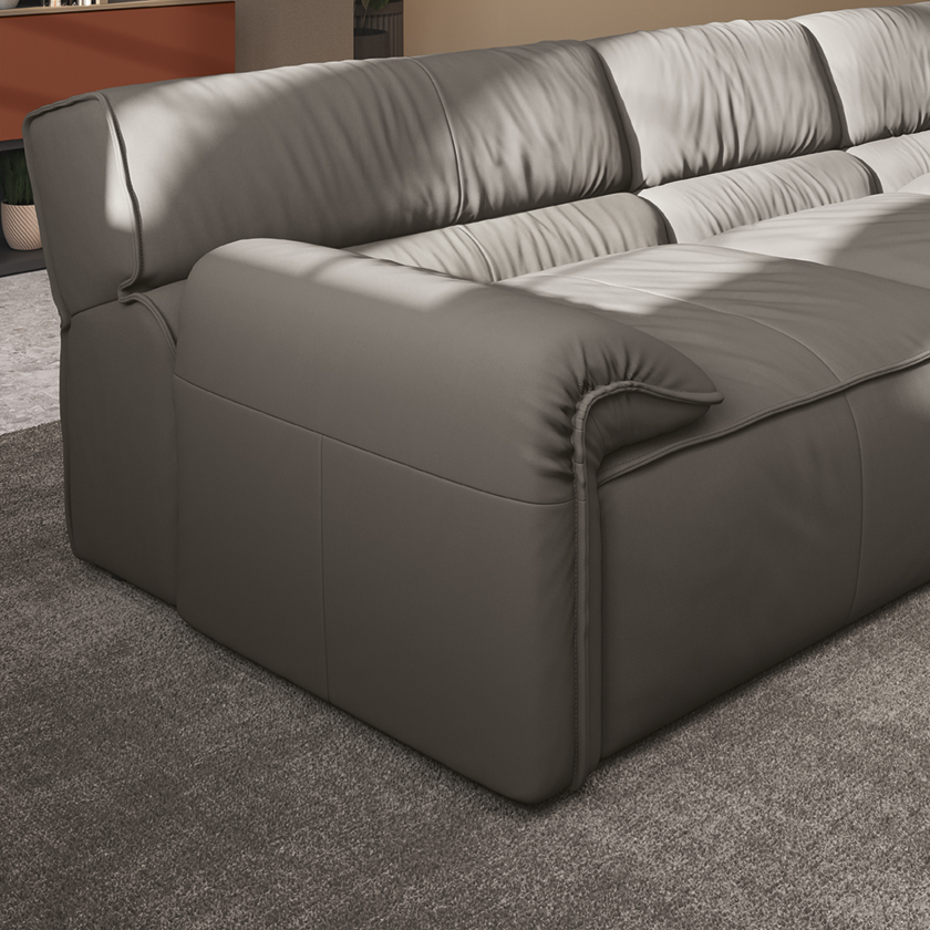 Piękna skórzana sofa daje przyjemne uczucie na pierwszy rzut oka. Precyzja podniesionych szwów, które biegną wzdłuż profili sofy, definiuje jej design i podkreśla jej otulające kształty. Modułowość jest dyskretna dzięki ukrytemu systemowi połączeń. Relaks jest gwarantowany dzięki pochyleniu oparć z poziomym zgięciem, które daje zintegrowany podparcie lędźwiowe, ergonomii podłokietników i możliwości wstawienia elementu leżanki.